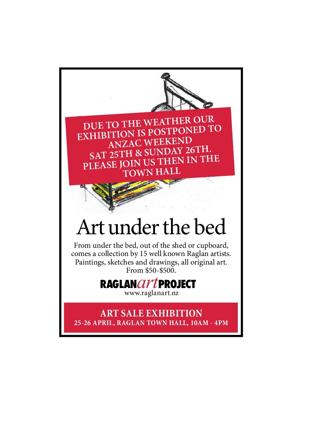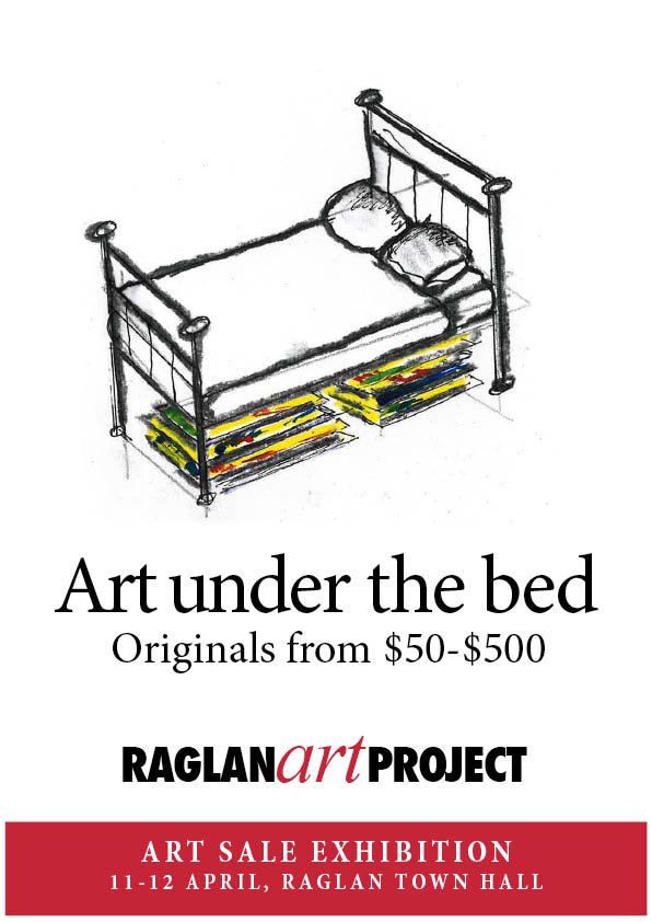 From under the bed, out of the shed or cupboard comes a collection by 15 of our well known Raglan artists. Paintings, sketches, photographs and drawings. All original art. From $50 – $500!